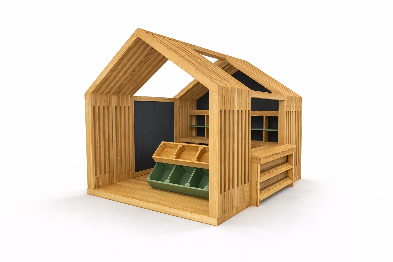 Domek XXL „Sklep” od MODULAKI to naturalna przestrzeń edukacyjnej zabawy. Drewniany market z półkami i skrzyniami rozwija kreatywność, samodzielność i współpracę.