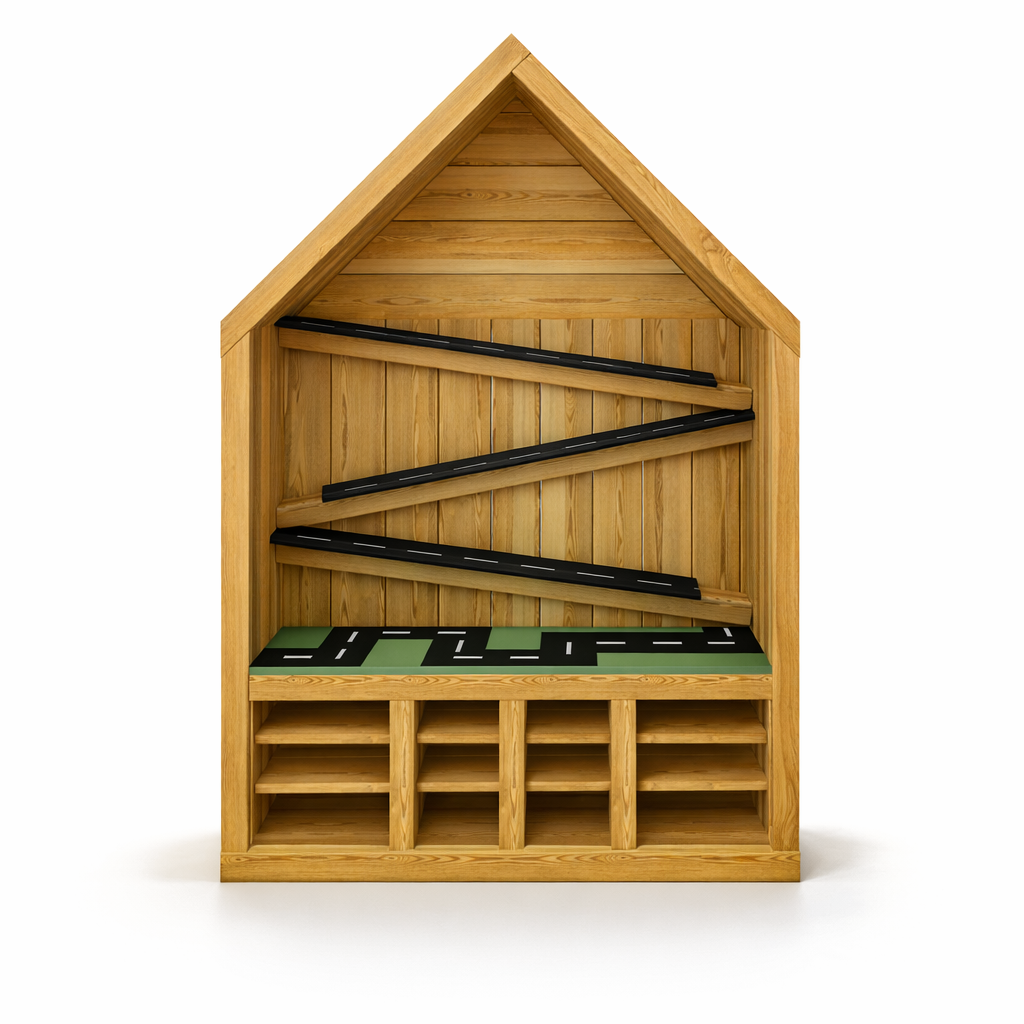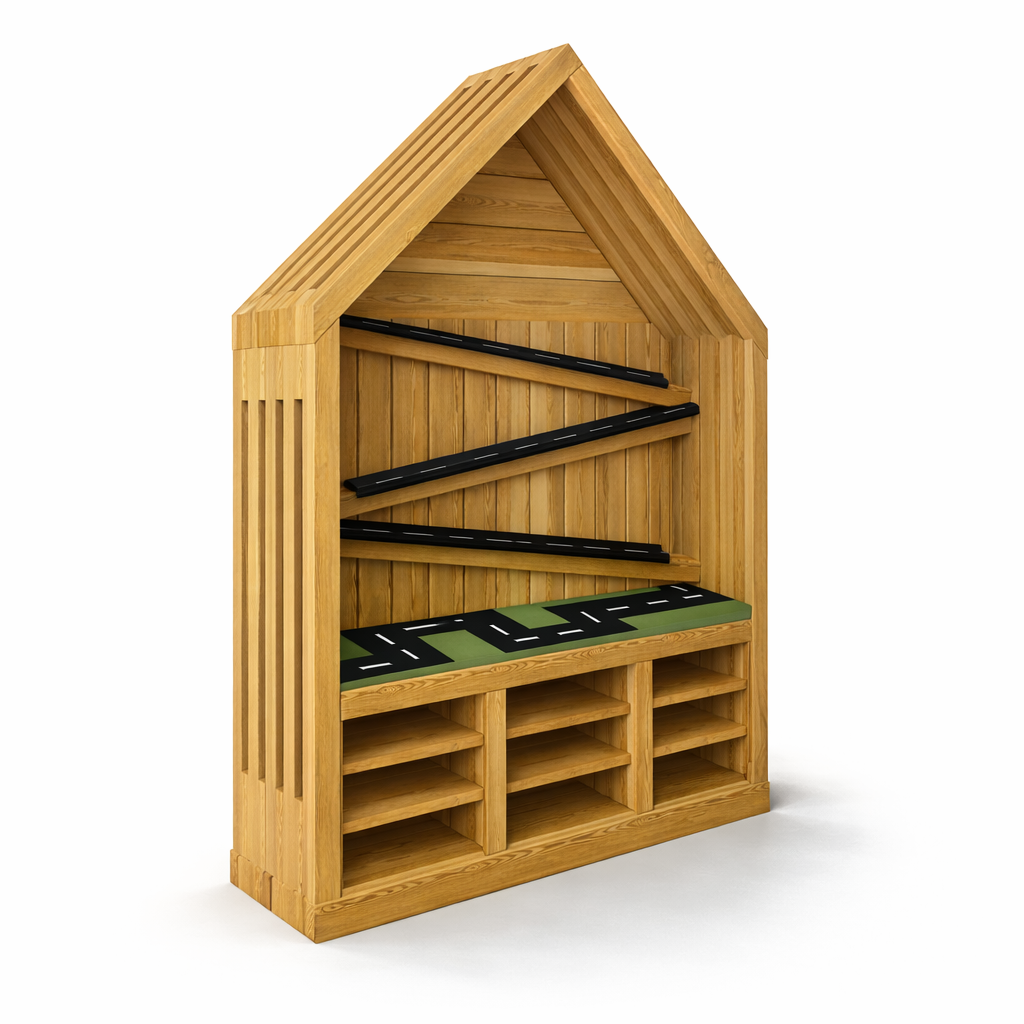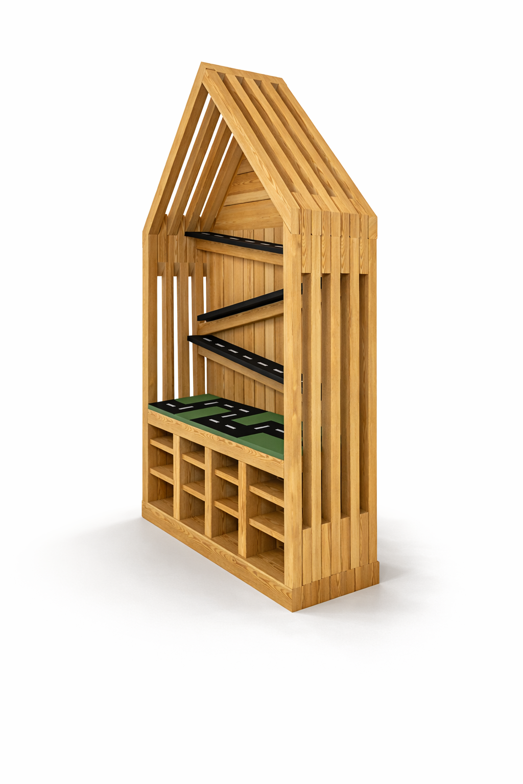 Domek został zaprojektowany jako warsztat małego konstruktora. Posiada tor zjazdowy dla samochodzików, półki do sortowania elementów i przestrzeń do zabaw manualnych. Zachęca do planowania, testowania i odkrywania zasad ruchu oraz przyczynowo-skutkowych zależności. Dzięki modułowej formie zajmuje niewiele miejsca, oferując bogatą funkcjonalność i możliwość łączenia z innymi domkami z serii.