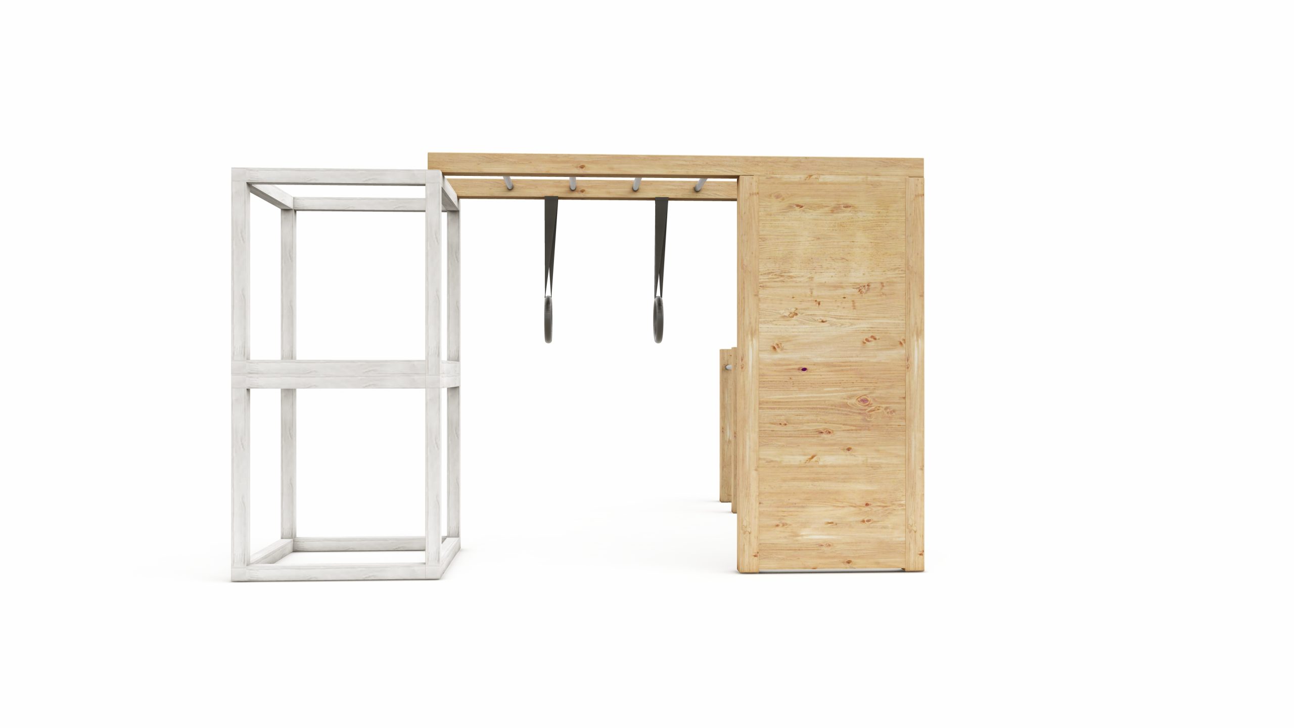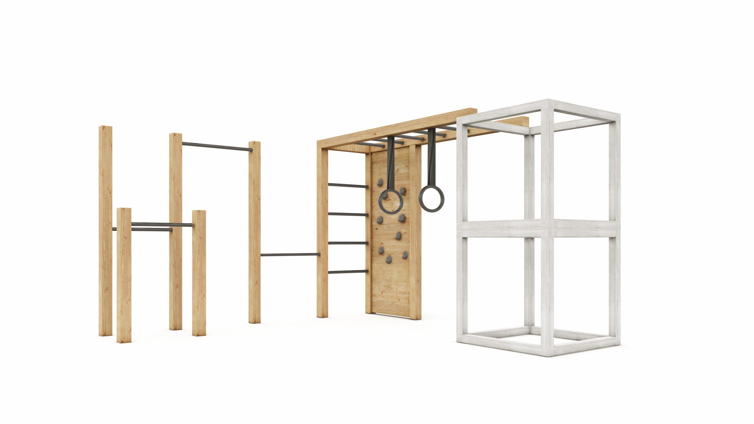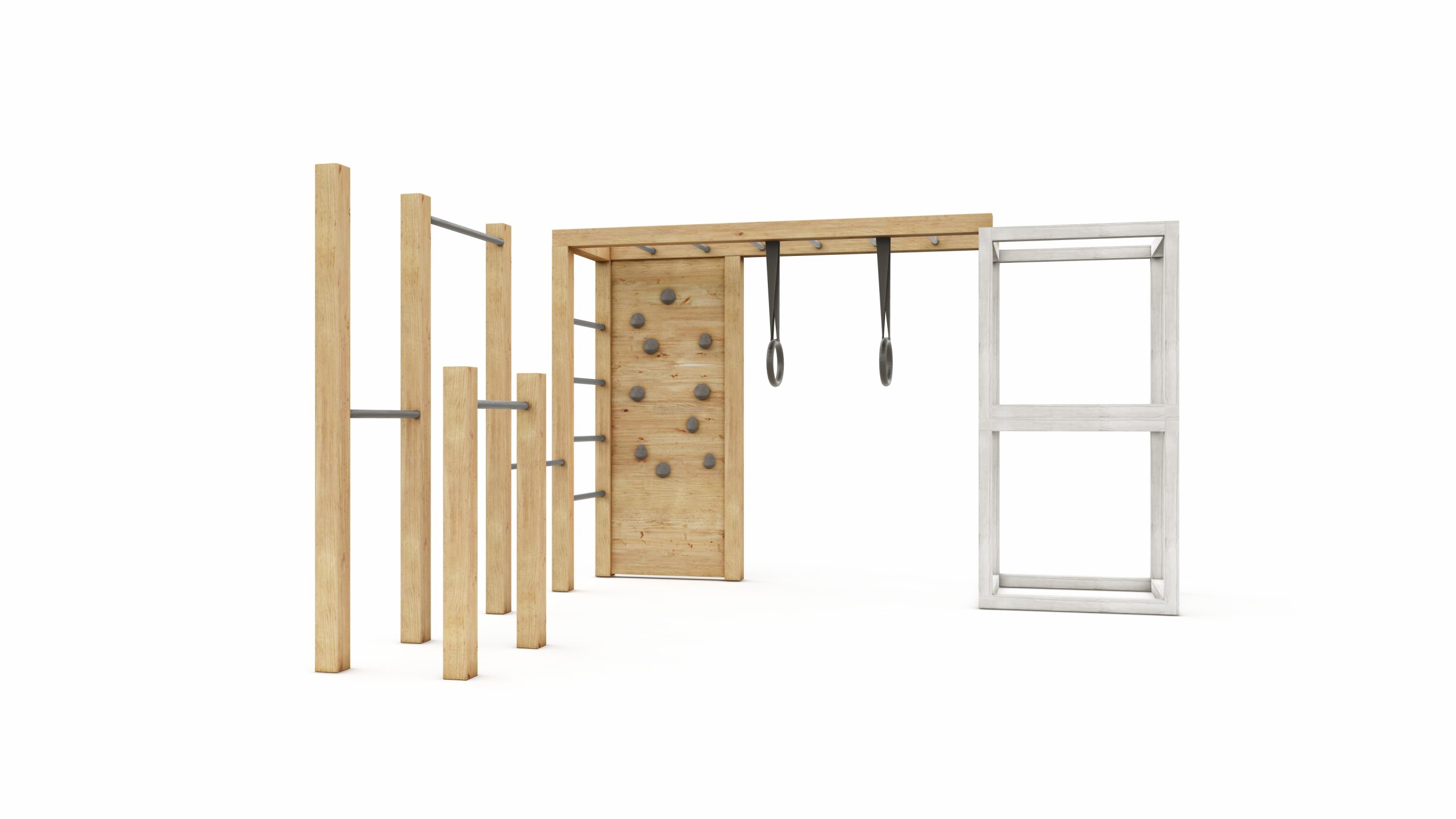 Siatka dostępna jest w kolorze czarnym z czarnymi łącznikami. Do wyboru są drążki w kolorze czarnym lub szarym, a kółka gimnastyczne w kolorze czarnym lub czarno-drewniane. Kolory kamieni wspinaczkowych również wybierasz według uznania.