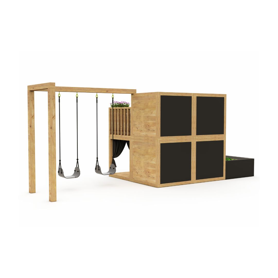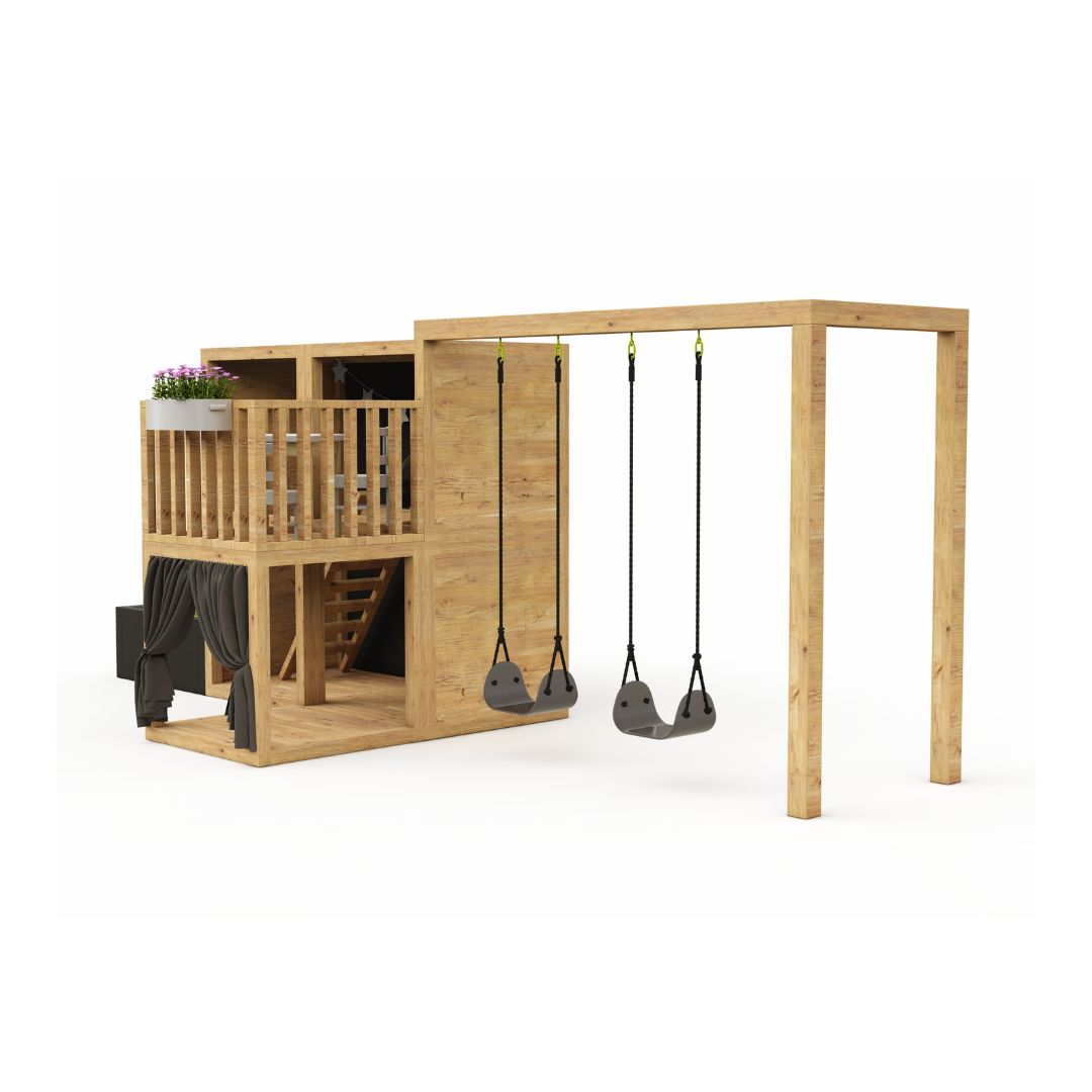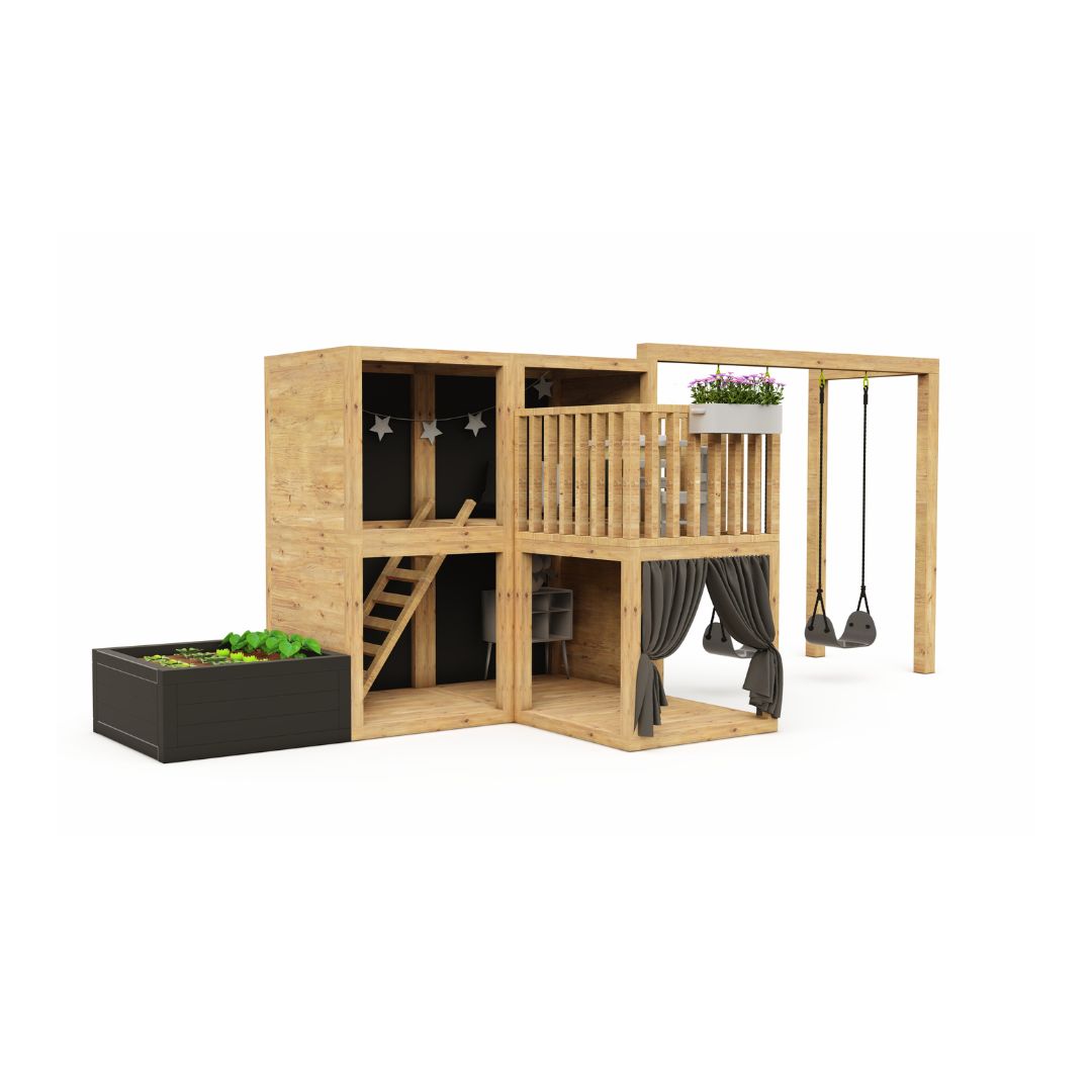 Ten zestaw to doskonała alternatywa dla domku na drzewie! Oryginalna, nowoczesna przestrzeń domku do zabawy w ogrodzie, a przy tym naprawdę bezpieczna.