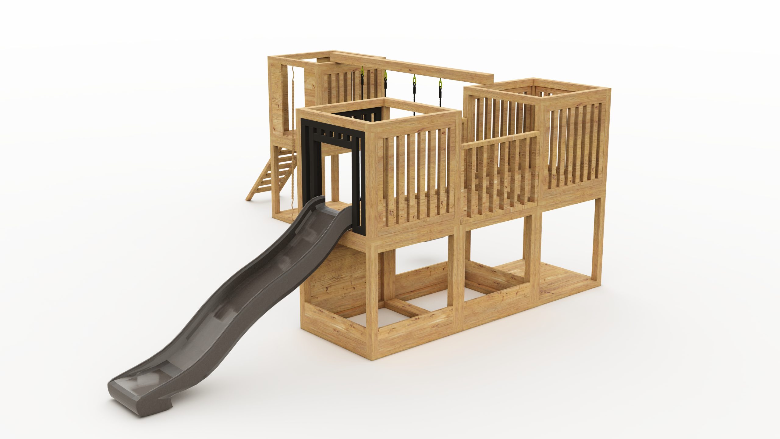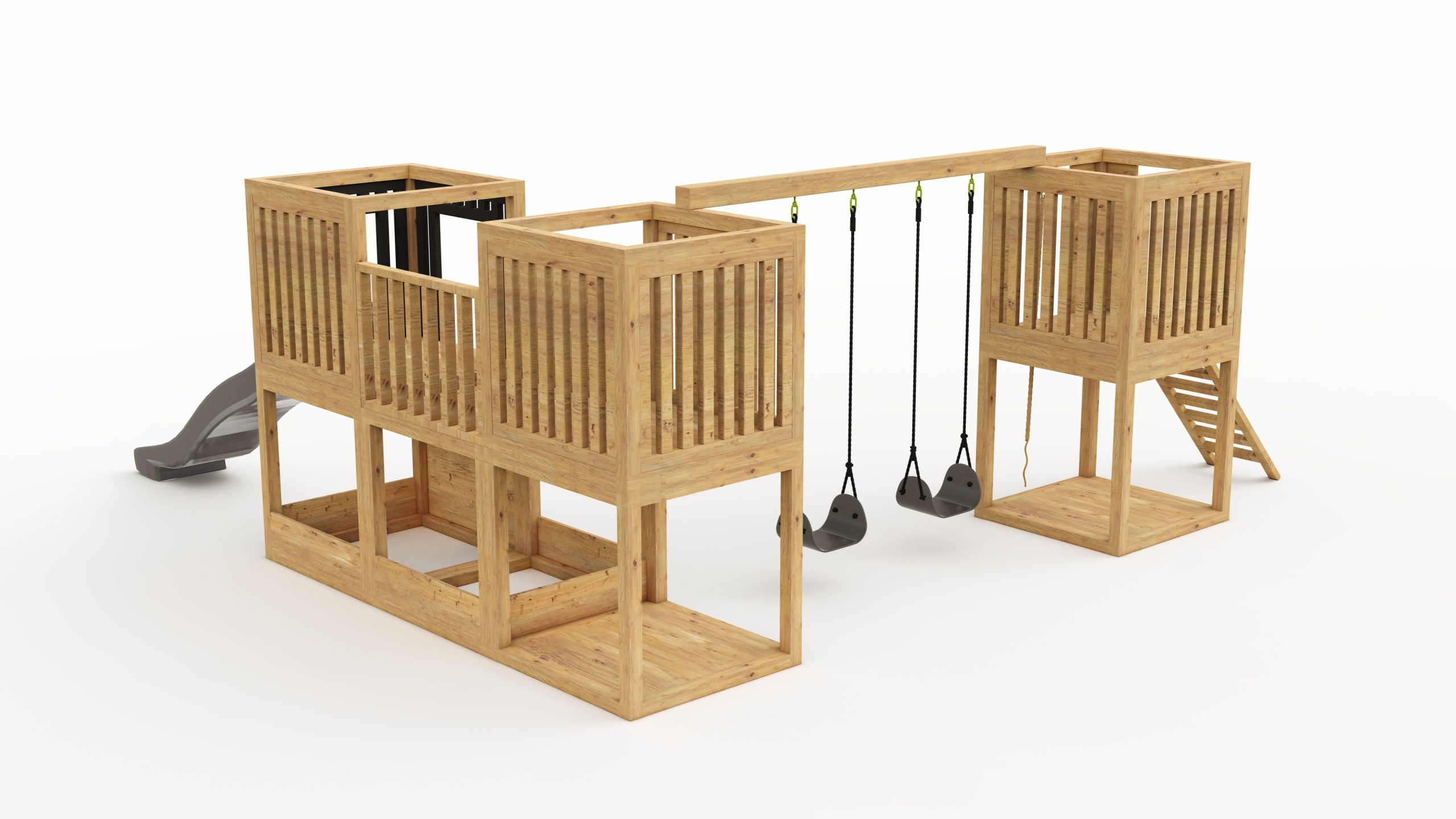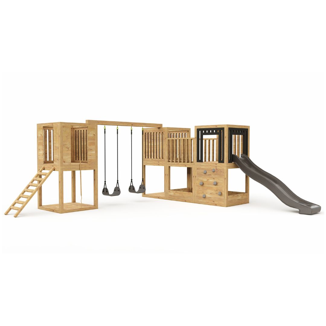 W skład zestawu nie wchodzą huśtawki, ślizg, kamienie wspinaczkowe oraz lina.