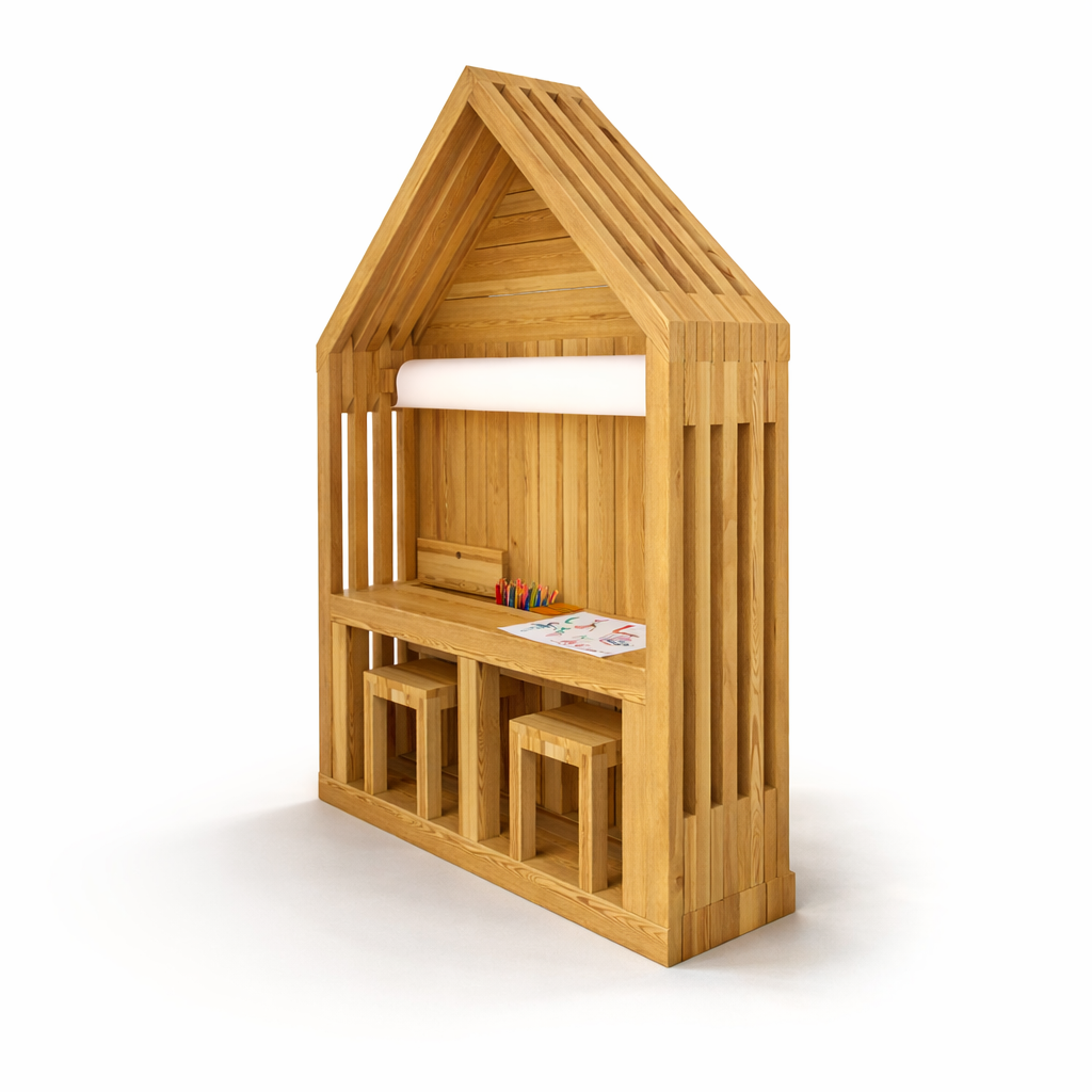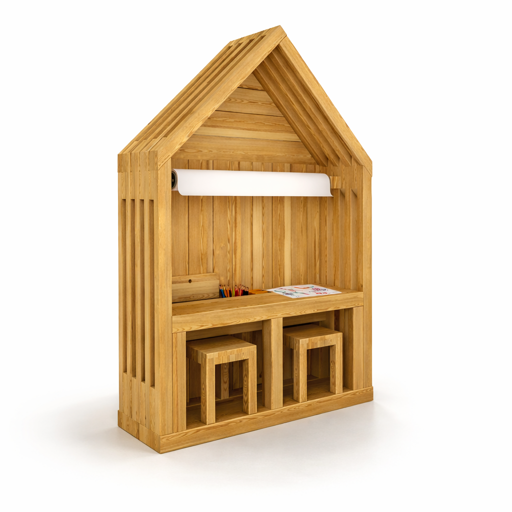 Wbudowany blat roboczy i system organizacji materiałów plastycznych.