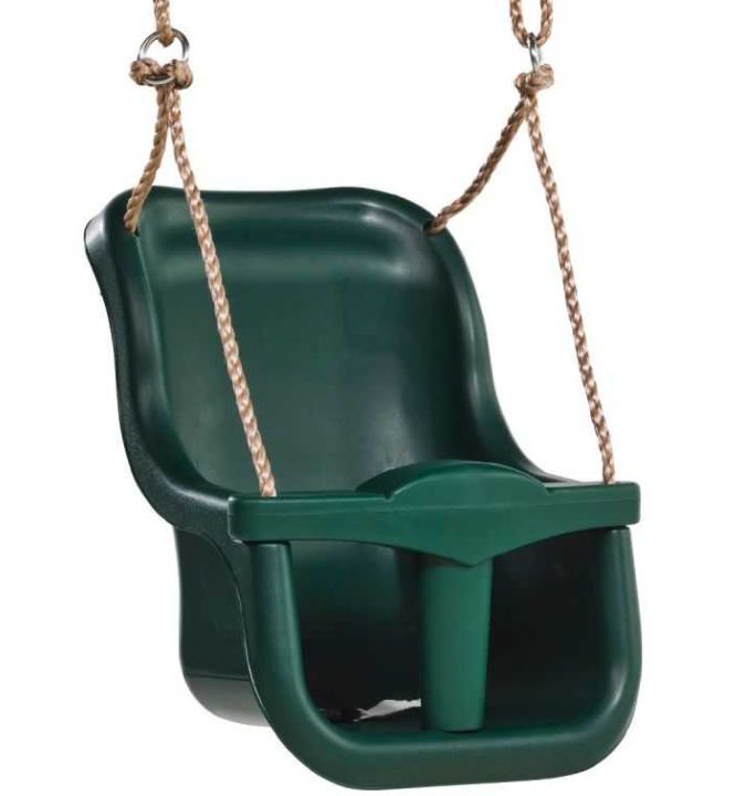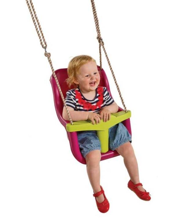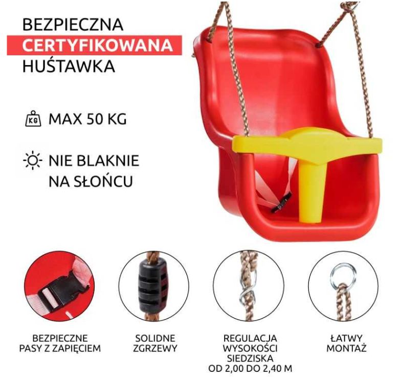 Model dedykowany najmłodszym użytkownikom placu zabaw.  Ergonomiczny kształt oraz głębokie oparcie zapewniają wygodę i stabilność, zaś pasy i pałąk bezpieczeństwa zadbają o to, żeby naszej pociechy nie spotkała żadna, przykra niespodzianka. Wszystkie krawędzie są zaokrąglone, żeby zminimalizować ryzyko kontuzji nawet podczas intensywnej zabawy. Syntetyczna, wodoodporna lina jest mocna, ale gładka i miła w dotyku. Nie ma obaw, że dziecko otrze sobie dłonie.
