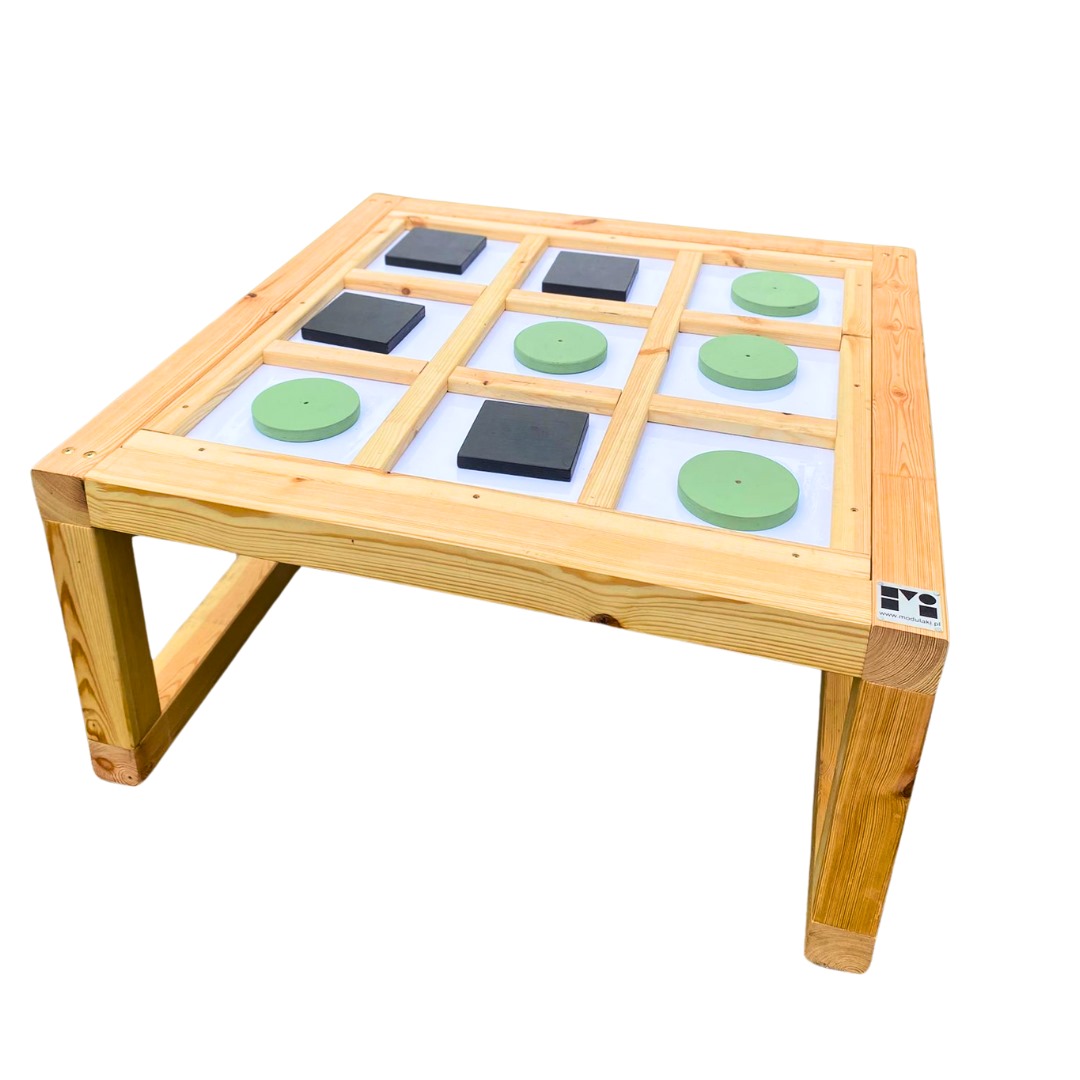 Blat stolika został zaprojektowany tak, aby dzieci mogły rozgrywać klasyczne układy w kółko i kwadrat, ćwicząc przy tym planowanie i koordynację ręka–oko. Dzięki solidnej, drewnianej konstrukcji i dużym elementom stolik jest bezpieczny w użytkowaniu i trwały nawet przy intensywnej eksploatacji.