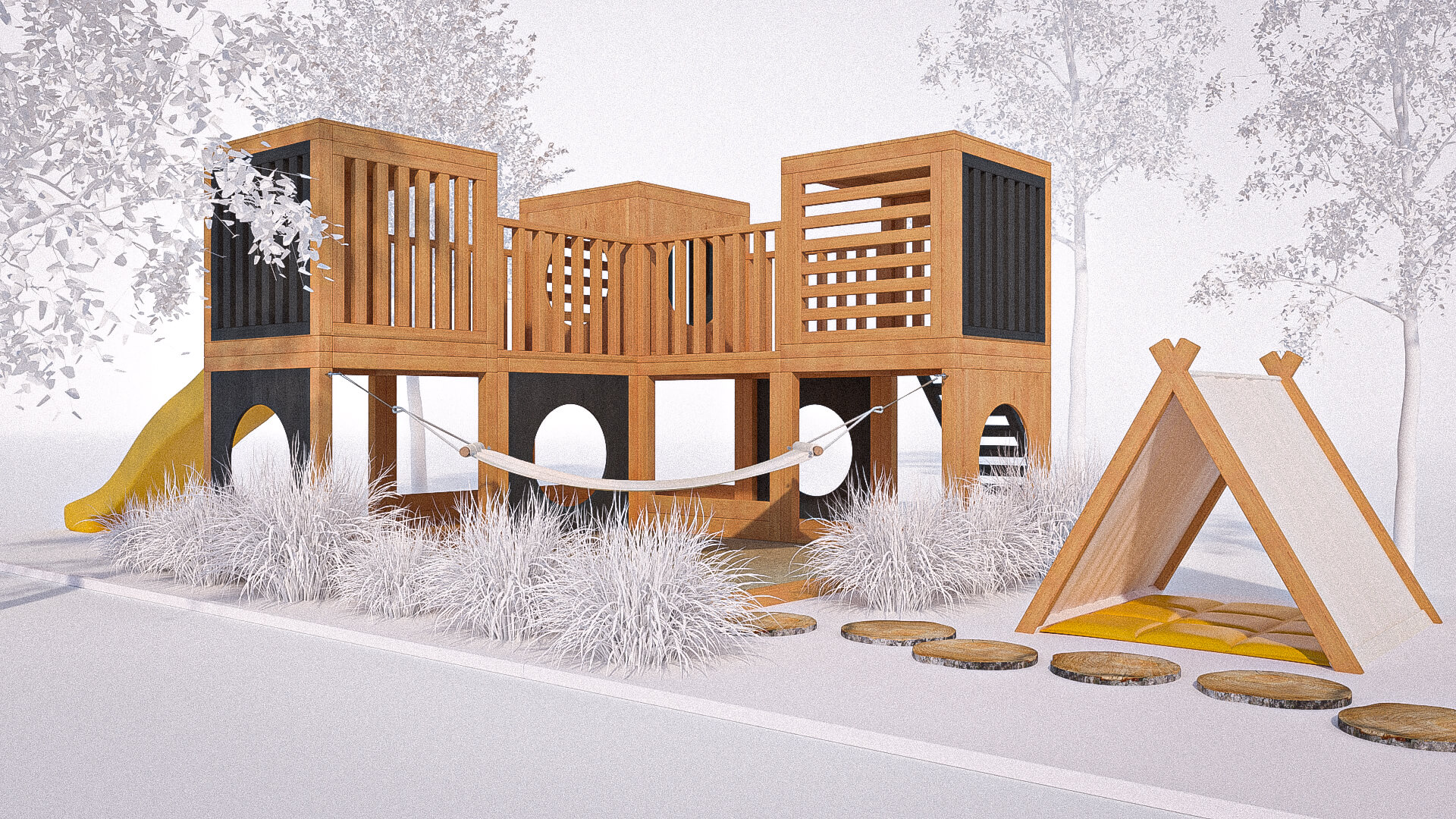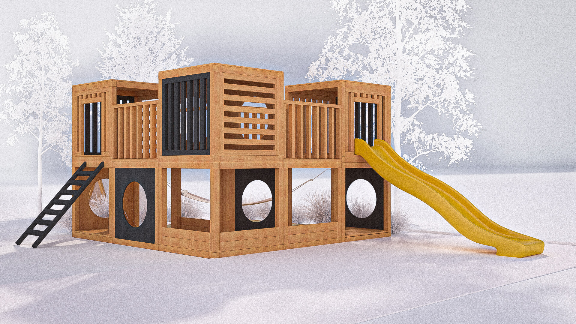 Wymiary: zestawu: 3x3m, kantówki: 10x10cm, 7x7cm, grubość deski: 2cm