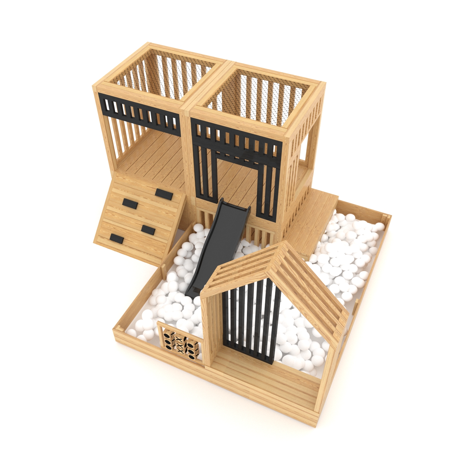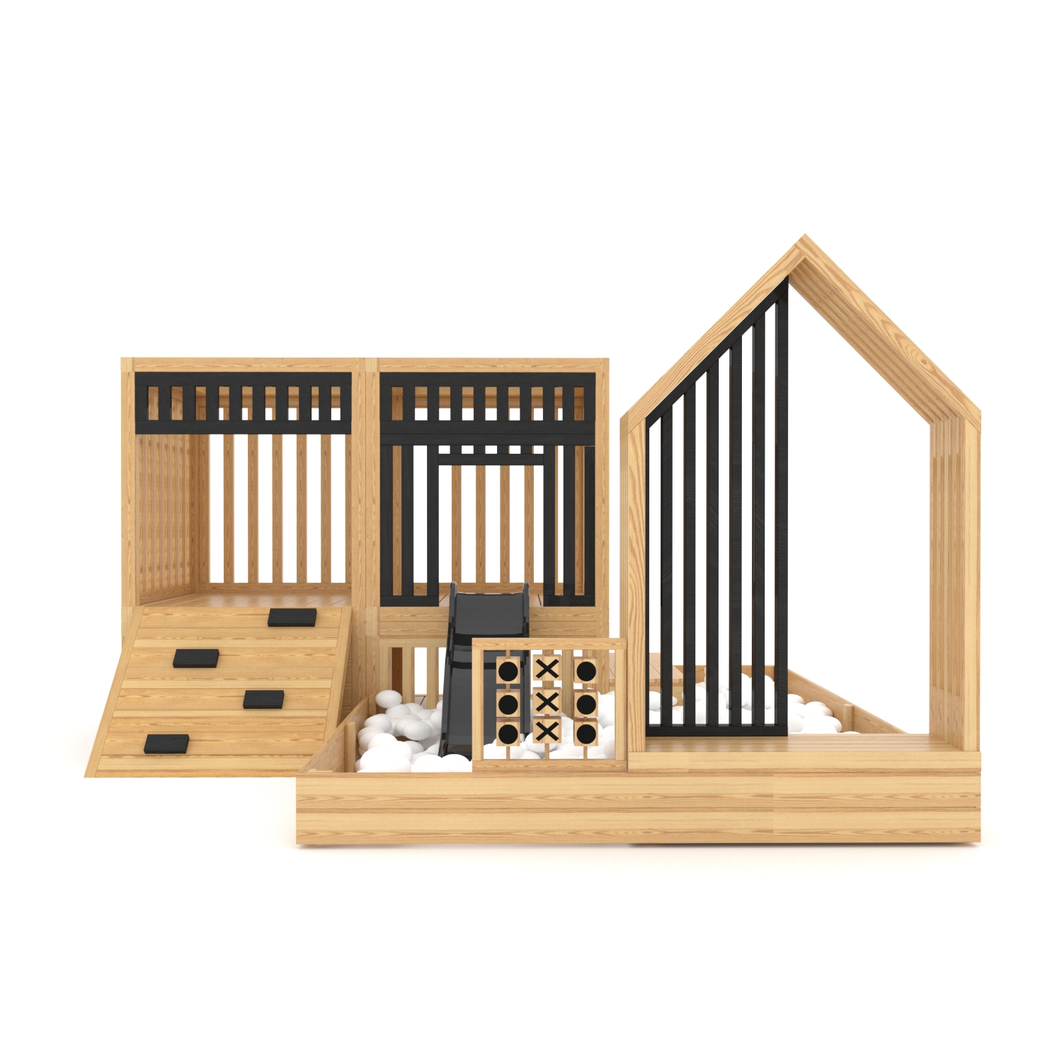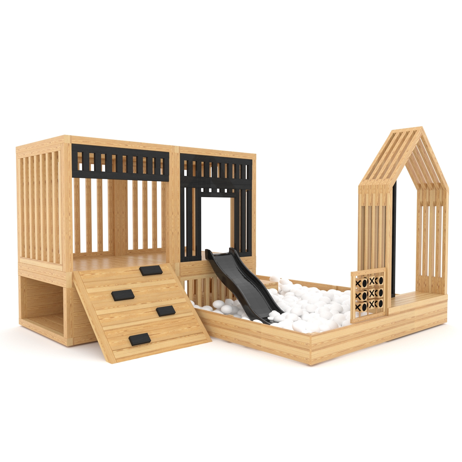 W skład zestawu wchodzi kompletny plac zabaw : konstrukcja drewniana, zjeżdżalnia plastik 1,2m, siatki, liny