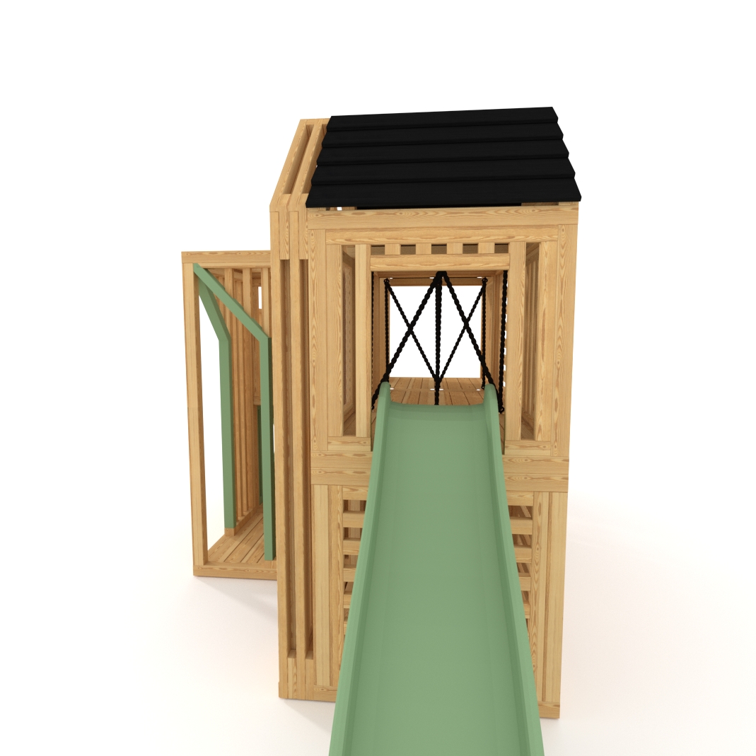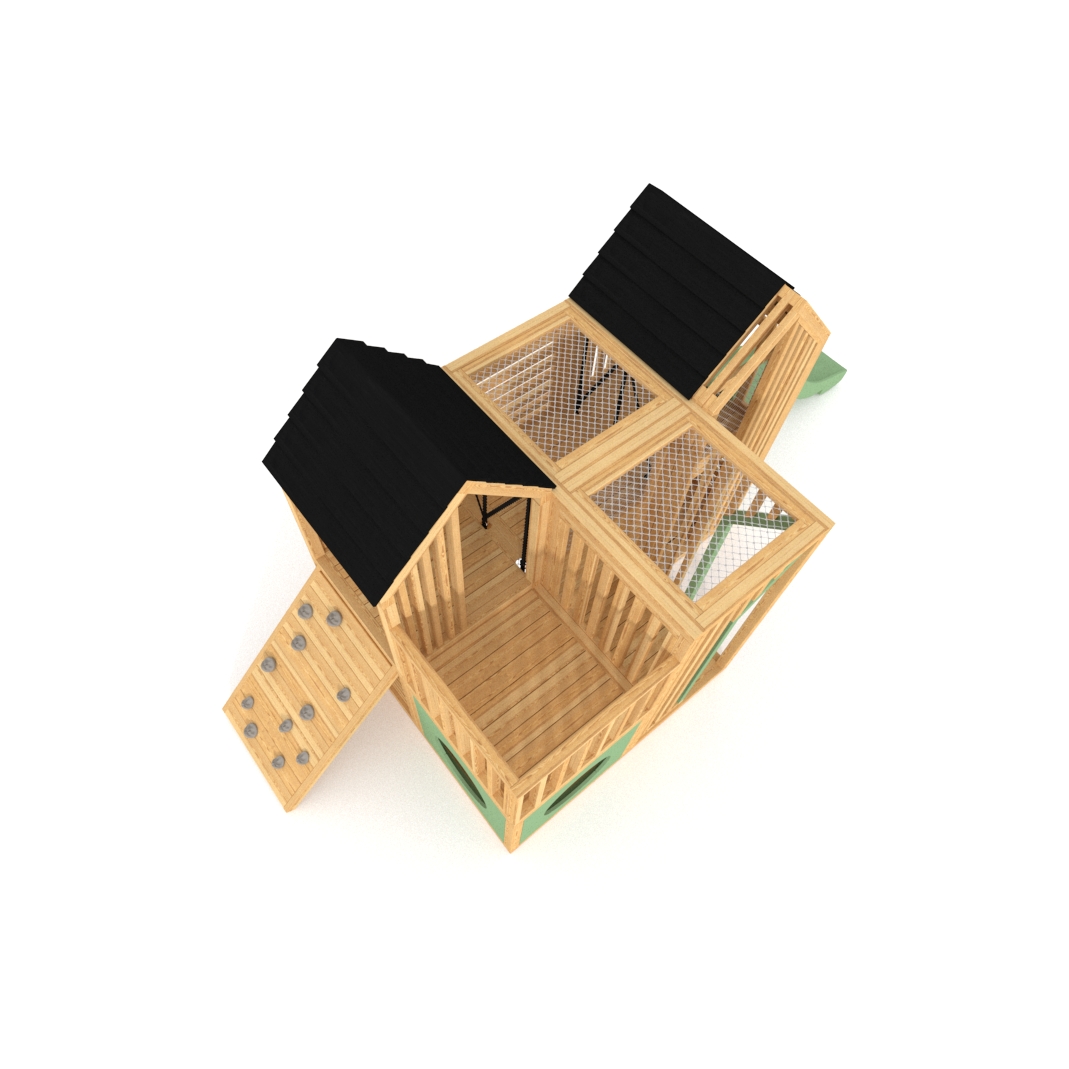 W skład zestawu wchodzi kompletny plac zabaw: konstrukcja drewniana, beżowe siatki zabezpieczające, ślizg, wspinaczka z kamieniami.